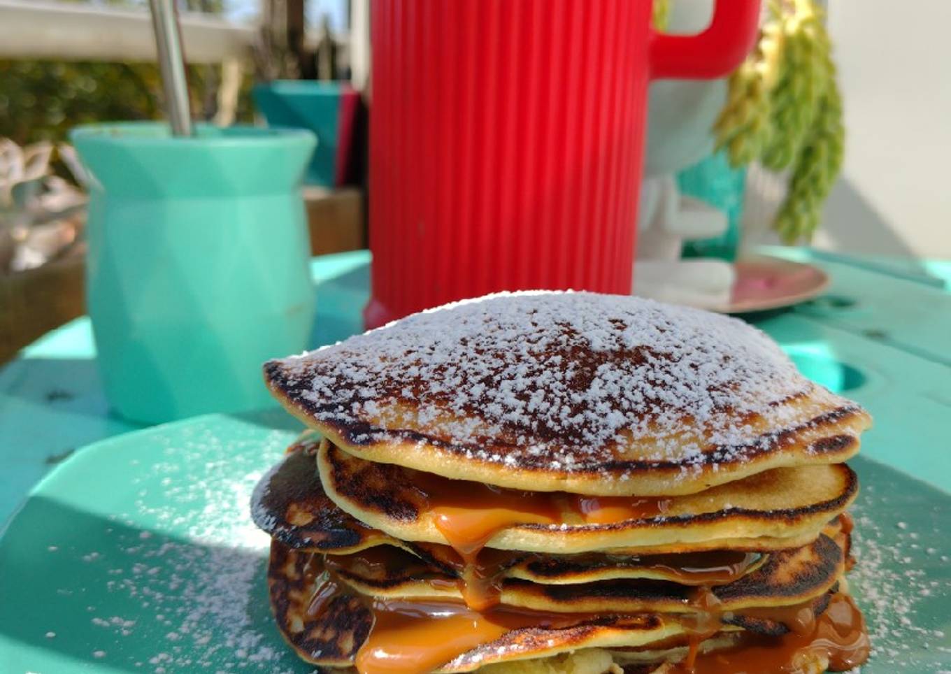 - Armar una torre intercalando hotcakes y dulce de leche (pueden ponerle lo que deseen, miel, mermelada, etc) y finalizar espolvoreando con azúcar impalpable escen